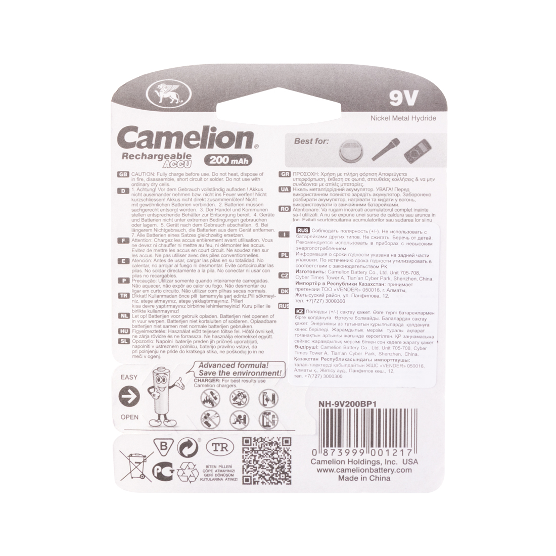 Аккумулятор, CAMELION, NH-9V200BP1, Rechargeable, Lockbox Rechargeable, 6F22(крона), 9V, 200 mAh, 1 шт., Блистер