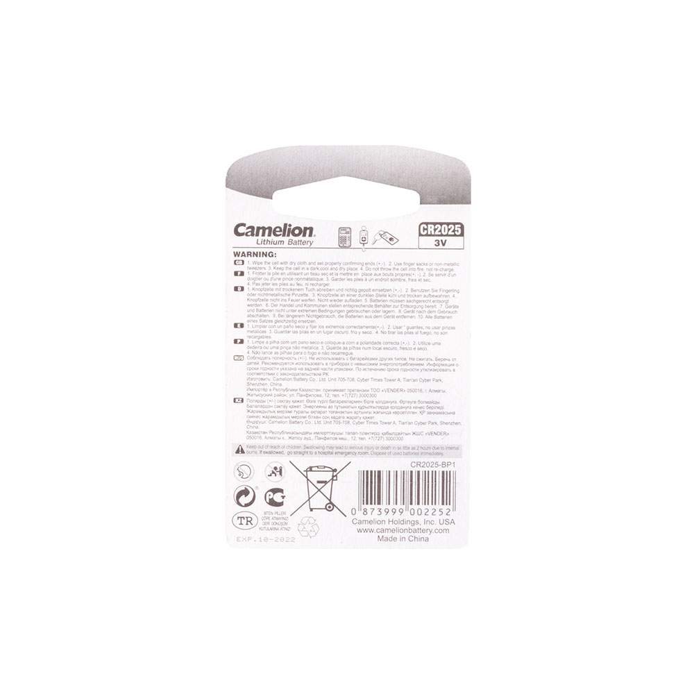 Батарейка, CAMELION, CR2025-BP1, Lithium Battery, CR2025, 3V, 220 mAh, 1 шт.