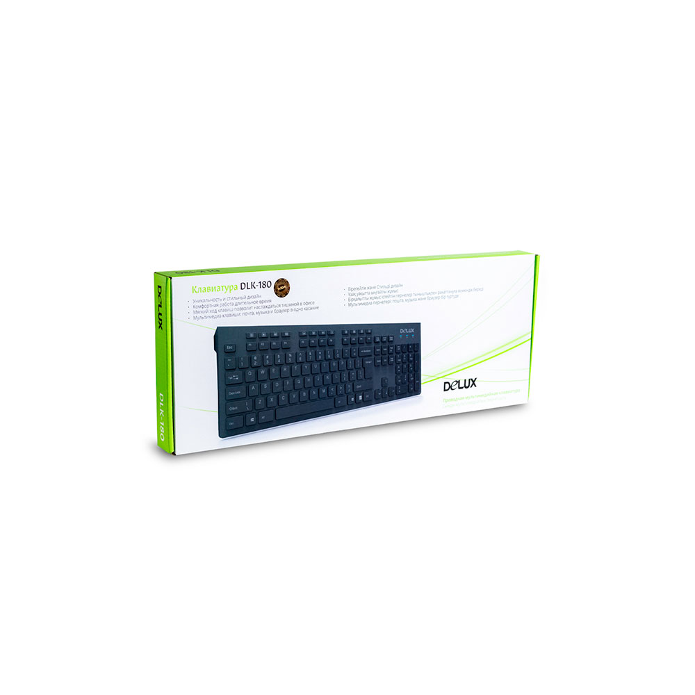 Клавиатура, Delux, DLK-180UB, USB, Кол-во стандартных клавиш 104, Размер: 439.2 x 141.5 x 25.5 мм., Длина кабеля 1,6 метра, Анг/Рус/Каз, Чёрная