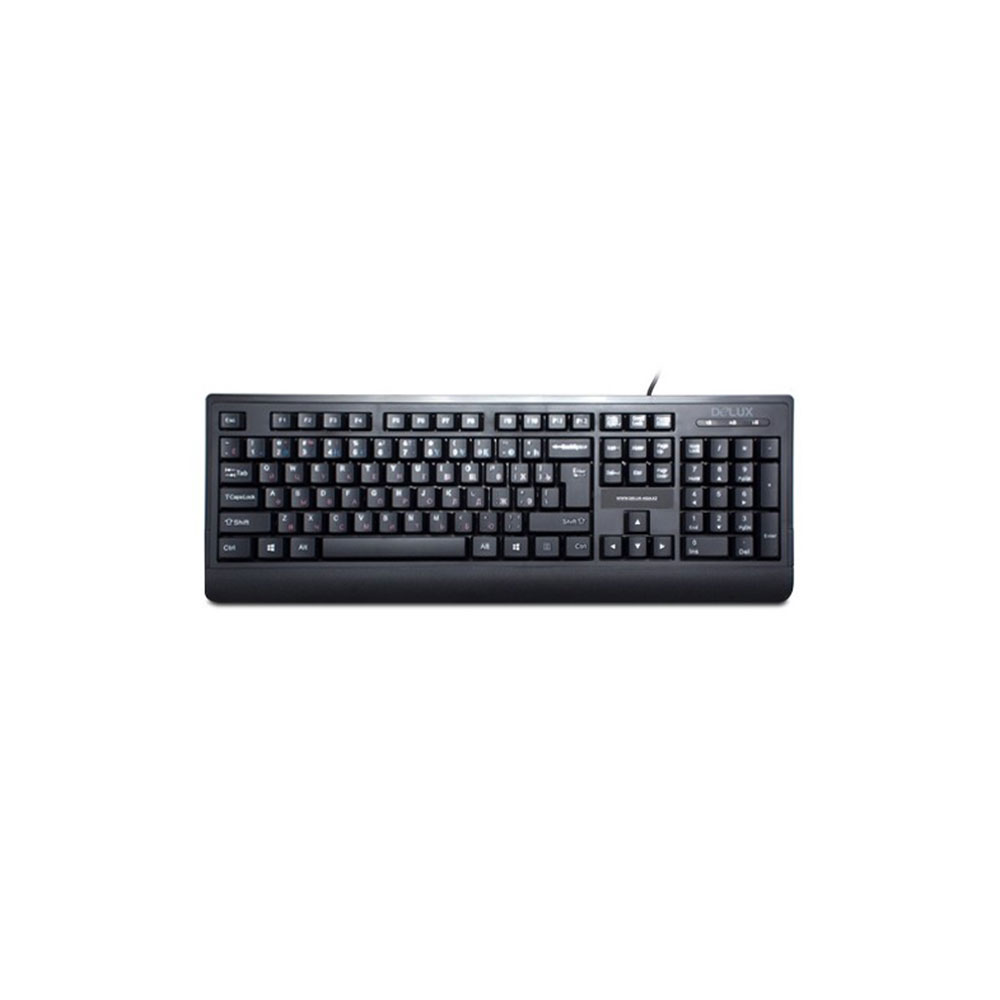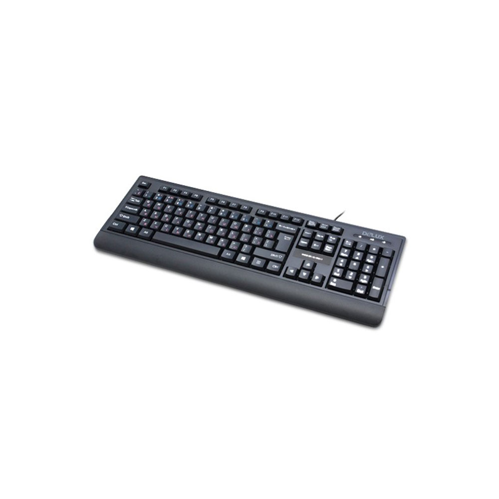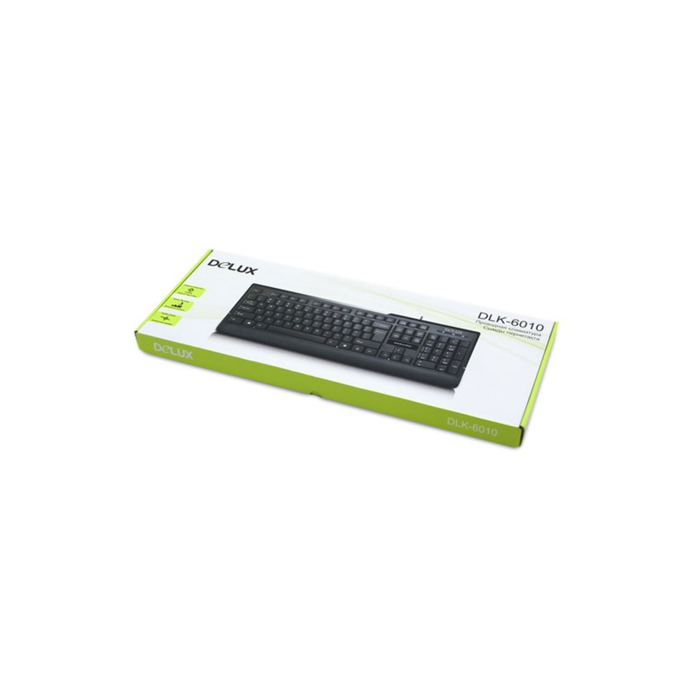 Клавиатура, Delux, DLK-6010UB, USB, Кол-во стандартных клавиш 104, Размер: 449,9*161,84*24,9 мм., Длина кабеля 1,4 метра, Анг/Рус/Каз, Защита от случайного пролива воды/кофе, Чёрный
