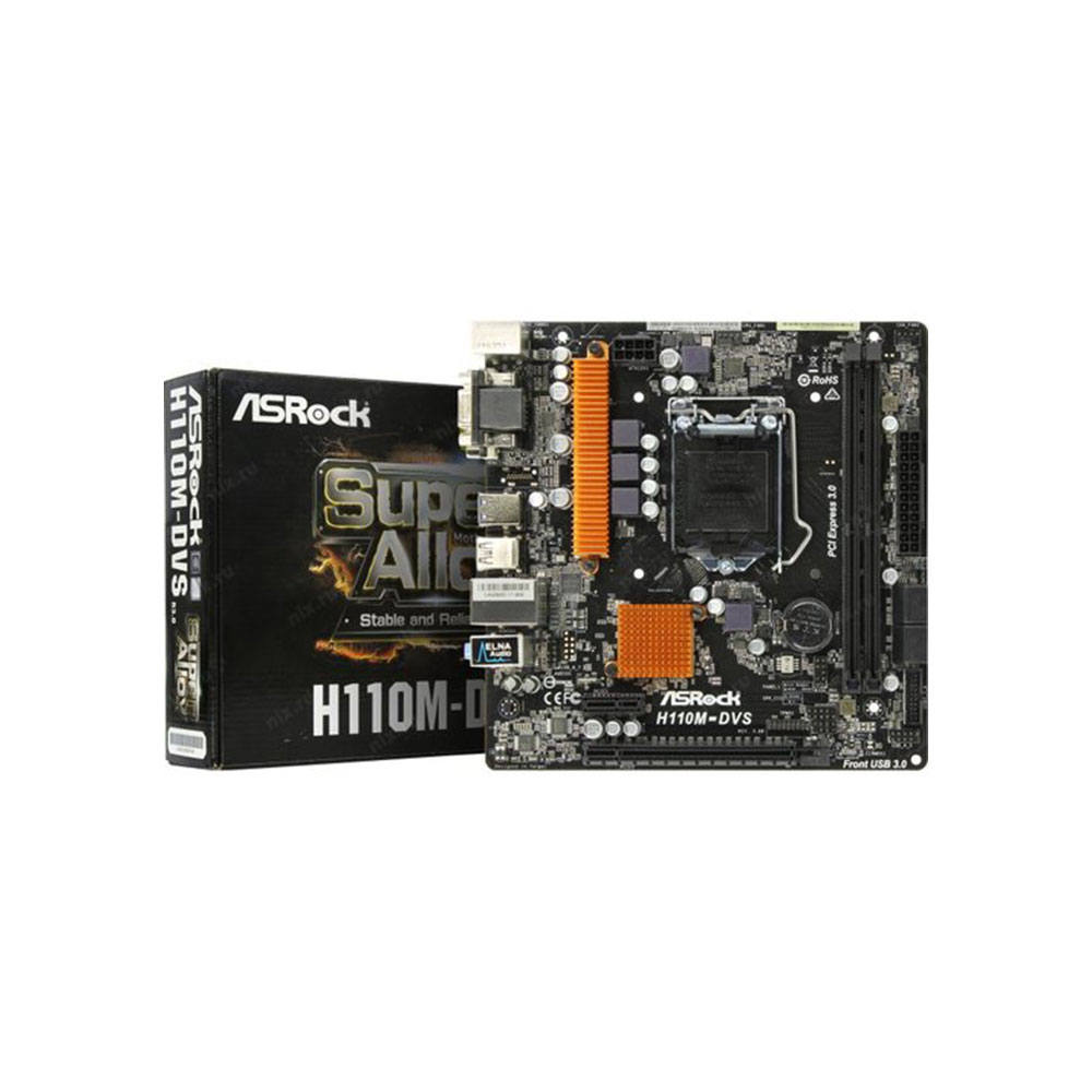 Материнская плата ASRock H110M-DVS R3.0 LGA1151 INTEL H110 2xDDR4 (2133 max 32Gb) 4xSATA3 1xD-Sub 1xDVI-D 1xPCI-E3.0x16 1xPCI-E2.0x1 4xUSB2.0 2xUSB3.0 7.1 CH HD Audio GLAN mATX BOX