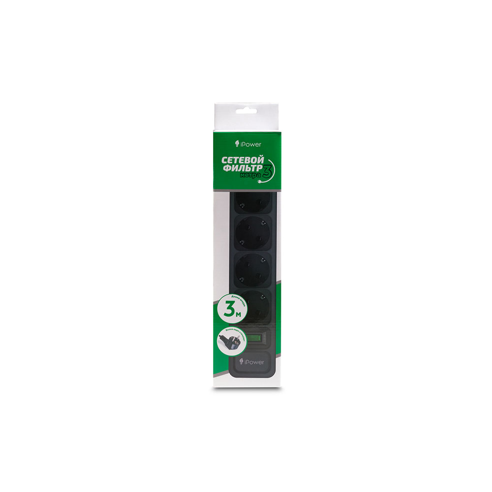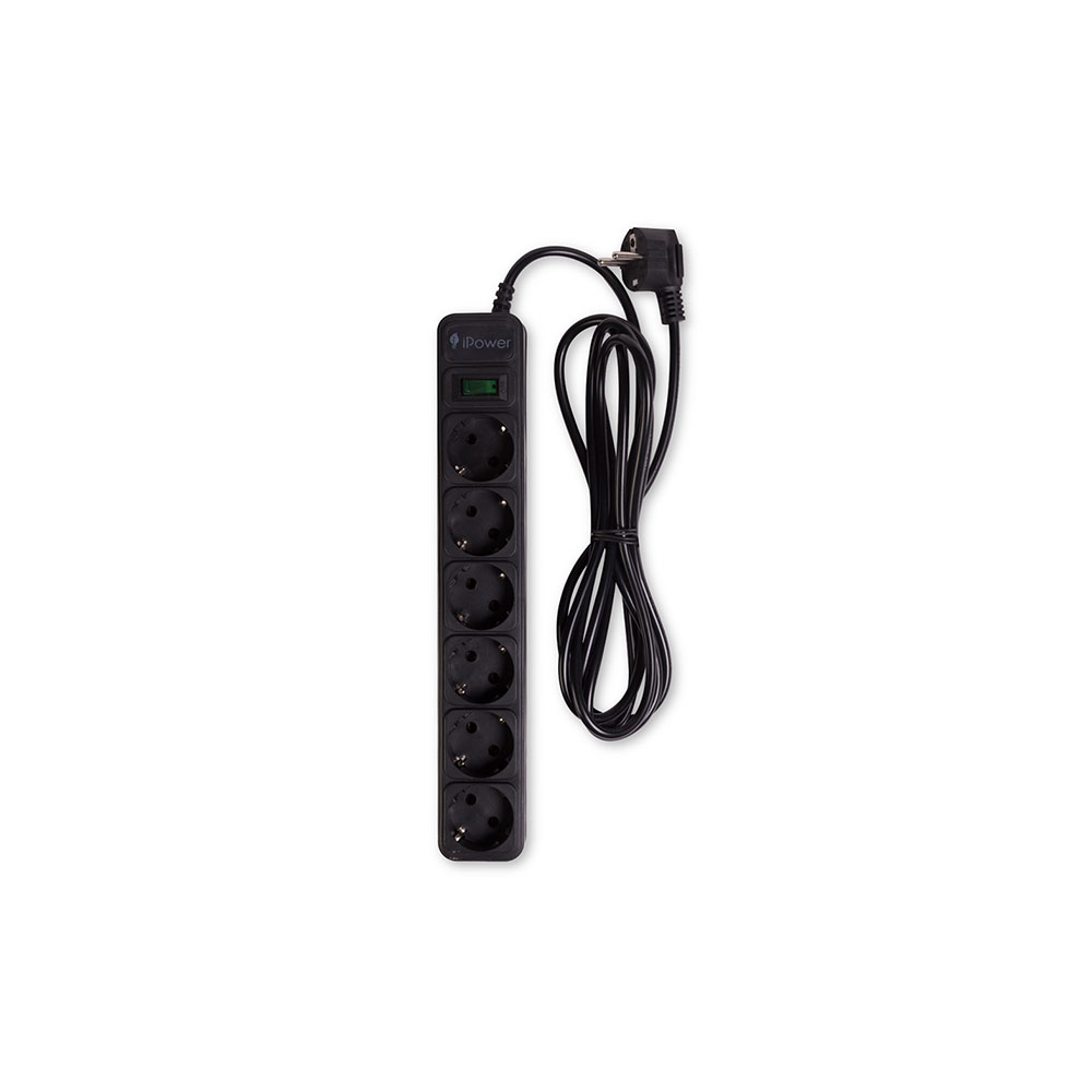 Сетевой фильтр, iPower, iPEO3m, 6 розеток, 3 м., 220-240V, 10A, Чёрный