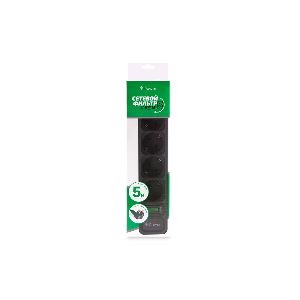 Сетевой фильтр, iPower, iPEO5m, 6 розеток, 5 метров, 220-240V, 10A, Чёрный
