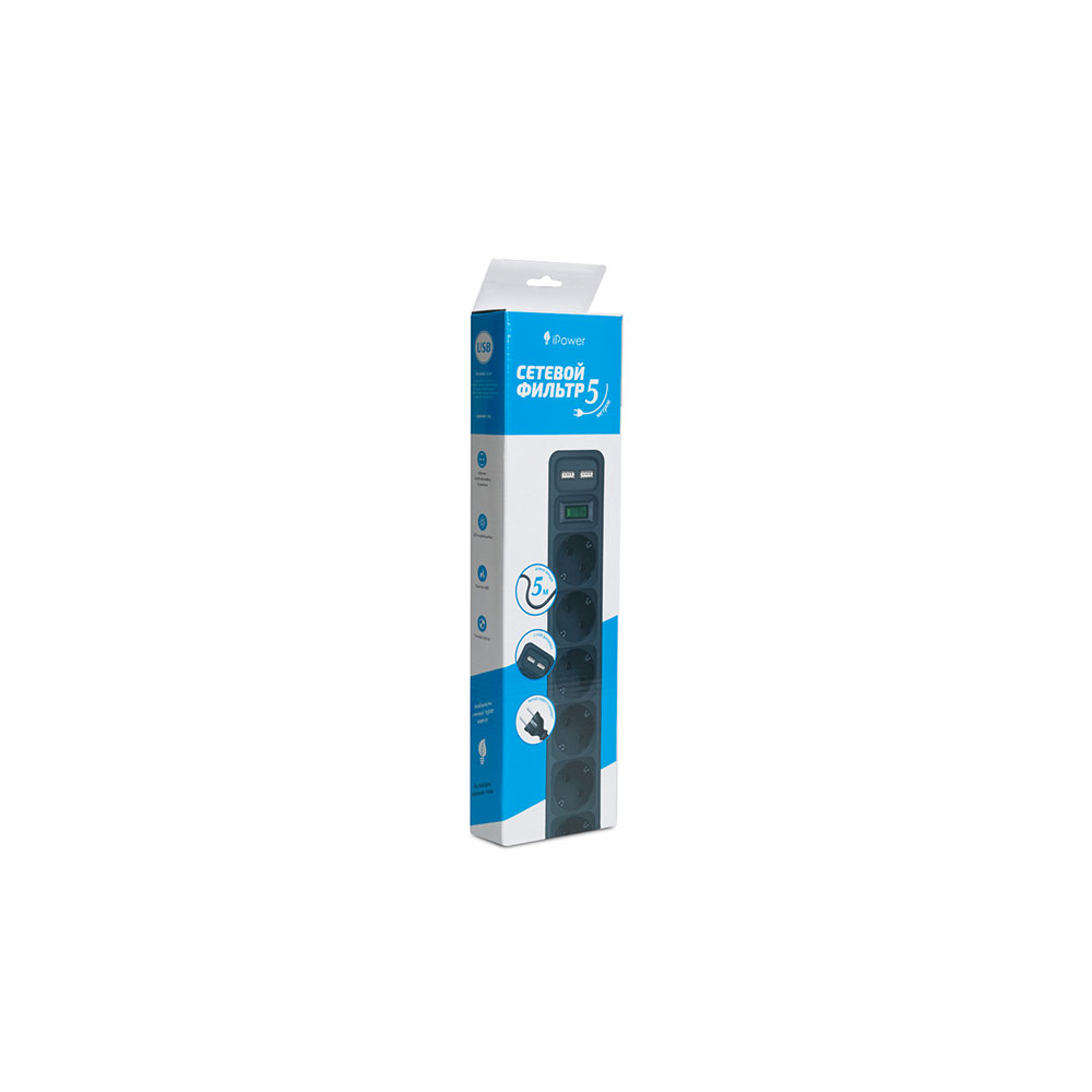 Сетевой фильтр, iPower, iPEO5m-USB, 6 розеток, 5 метров, Два USB-порта 220-240V, 10A, Чёрный