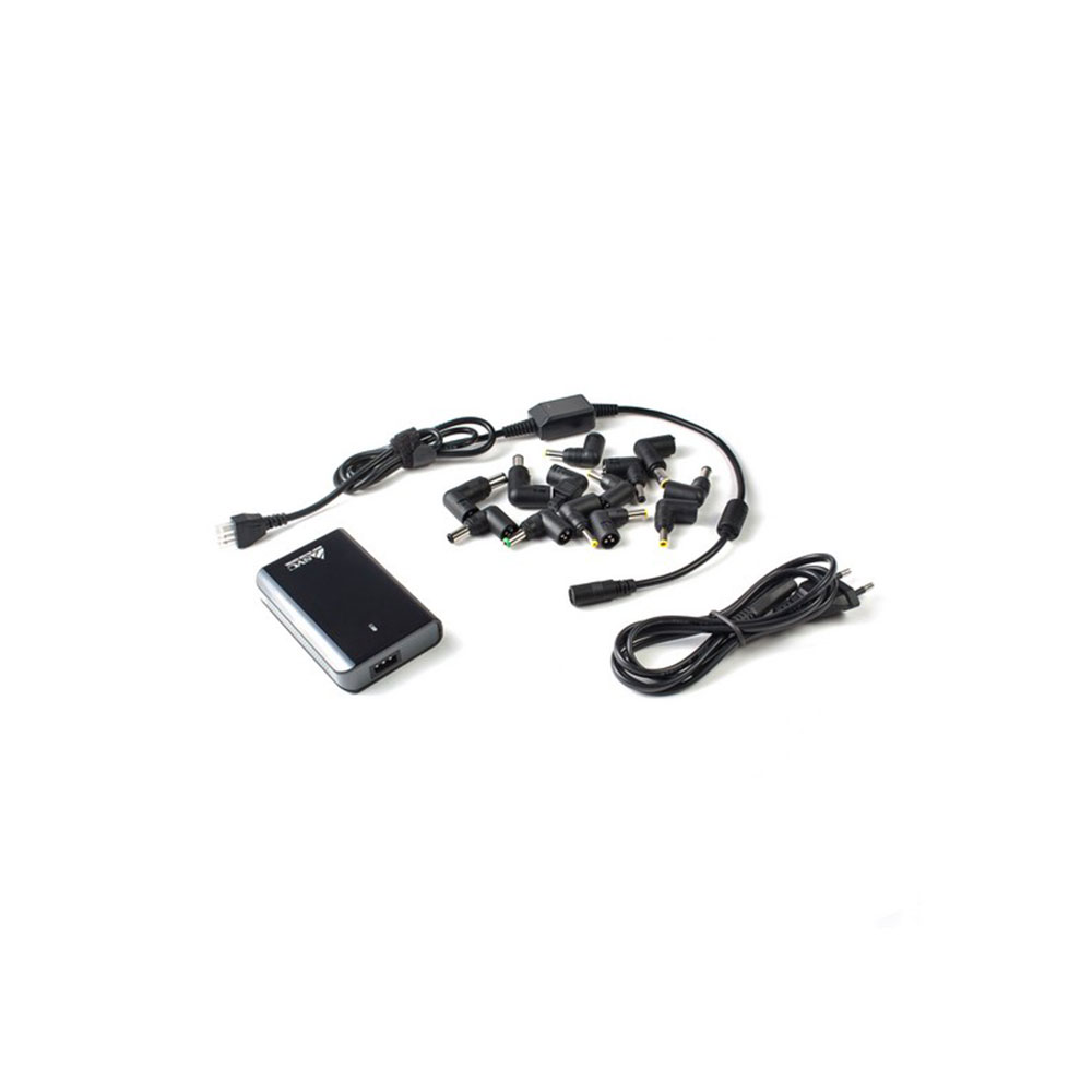 Универсальное зарядное устройство для ноутбуков с автоматической регулировкой напряжения и 13 сменными насадками, для зарядки ноутбуков, видео и фотокамер, мобильных устройств различных брендов.